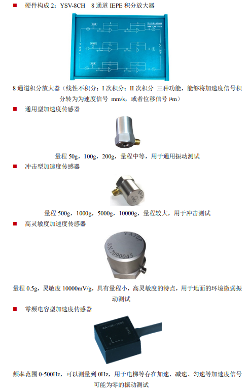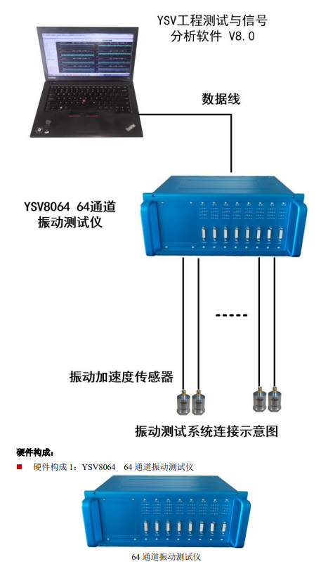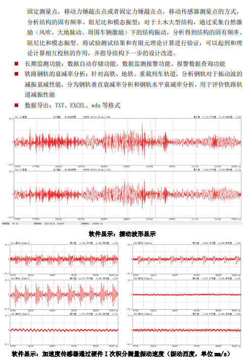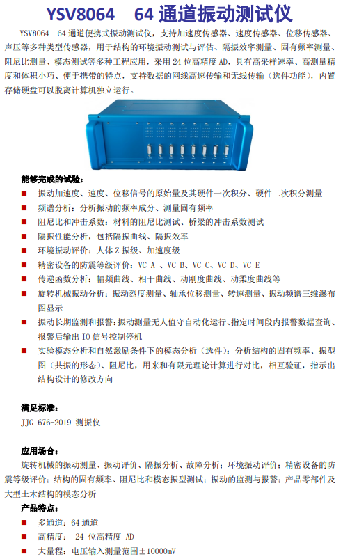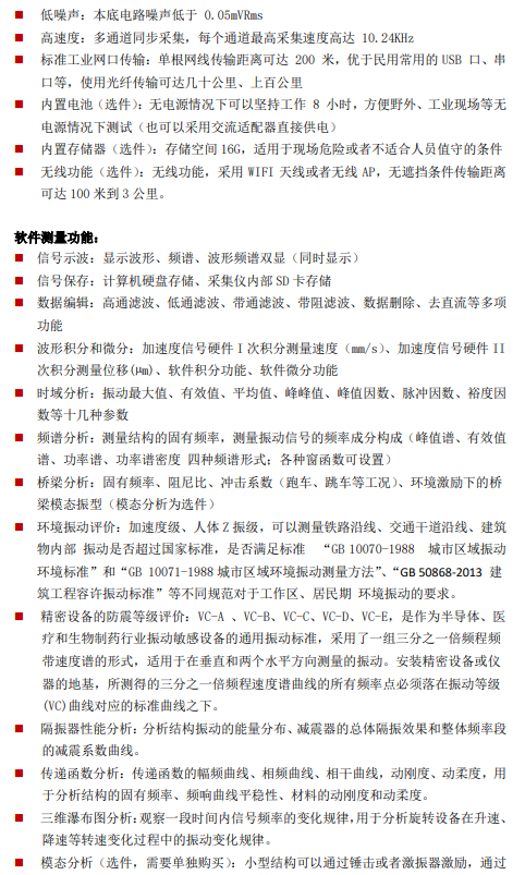 64通道24位AD,每通道支持IEPE传感器,采样速率为0-10.24KHz/Ch,网口传输。分析功能:加速度、速度、位移测量,时域分析、频谱分析、传递函数分析、阻尼比分析,隔振衰减率分析,VC振动等级分析、模态分析等